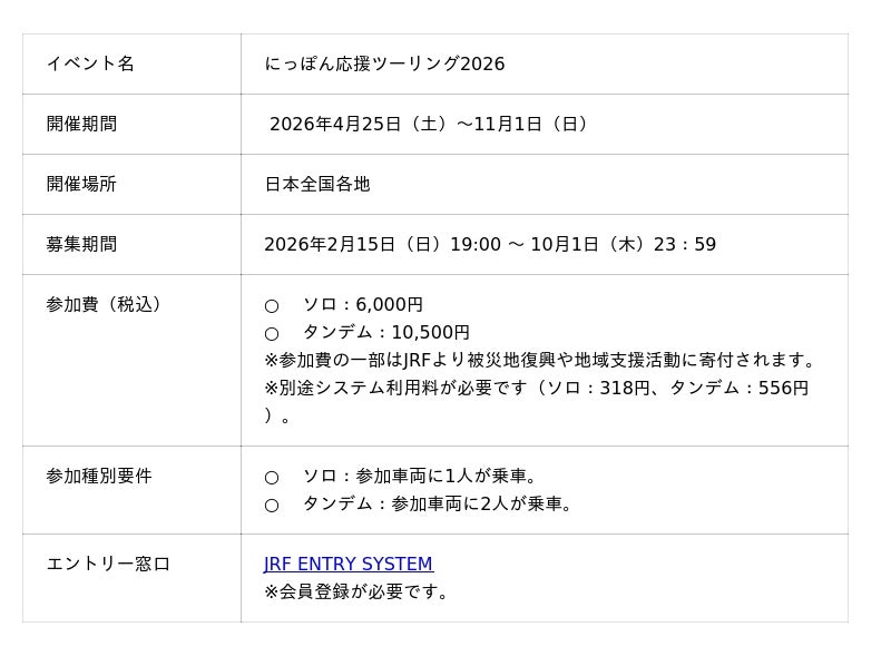 一般社団法人日本ライダーズフォーラム(以下、JRF / 本社:東京・渋谷区、代表/風間深志)は、ライダーの機動力を活かして日本各地の活性化を目指す「にっぽん応援ツーリング2026」を2026年4月25日(土)より開催いたします。7年目となる今年は、従来の目的地を巡るスタイルに加え、探索そのものを楽しむ「階層式隠しウェイポイント制度」を新たに導入し、ライダーの知的好奇心を刺激する新しいツーリングの遊び方を提案します。