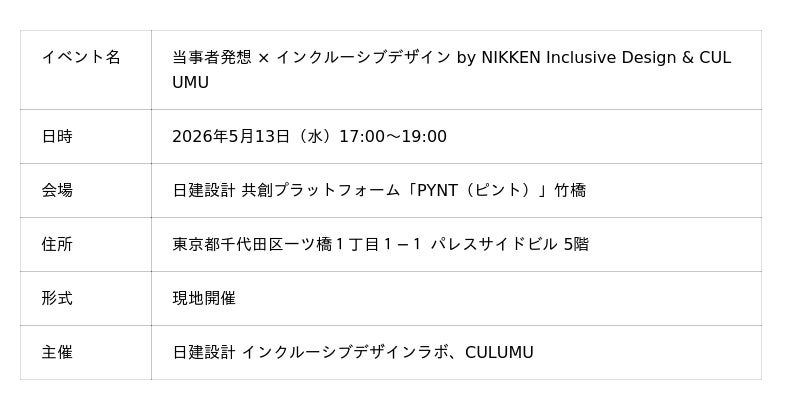 【5/13開催】『当事者発想 × インクルーシブデザイン』|CULUMUが日建設計と共創イベントを開催