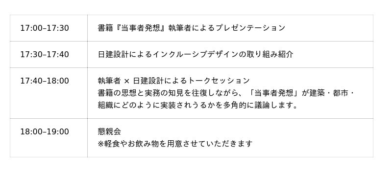 本イベントでは、書籍の執筆者3名と日建設計のインクルーシブデザインチームが登壇し、「当事者とともに考える」視点を起点に、建築・都市・組織における新たな価値創出のあり方を探ります。単なる思想紹介にとどまらず、実践との接続を通じて、社会実装の可能性を議論する場となります。