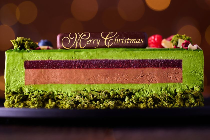 ナイフで切り分けた先には、6層の断面がお出迎え。土台には、しっとりとした宇治抹茶スポンジと、ザクザクとした食感の宇治抹茶チョコレートのフィアンティーヌを忍ばせ、宇治抹茶チョコレートムースでカシスとラズベリーのジュレ+ダークチョコレートのムースを囲い、艷やかな宇治抹茶グラサージュでコーティングしました。クリスマス限定の宇治抹茶チョコレートケーキです。