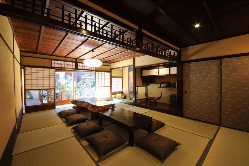 町家ならではの構造美を活かした梁組みの吹き抜け空間は、準棟纂冪(じゅんとうさんぺき)様式の高天井が広がりと落ち着きをもたらし、訪れる人を非日常へと誘います。自然素材と職人の手仕事が織りなす温かな設えの中、樹齢三千年の屋久杉一枚板を用いたテーブルが荘厳な存在感を放ち、食事や語らいの時間に深みを添えます。9名様まで滞在可能な広々とした間取りは、ご家族やグループ旅行にも最適。添い寝のお子様(6歳未満)は無料でご利用可能です。さらに床暖房や最新キッチン、Wi-Fiなど現代的な快適設備を整え、長期滞在や海外からのお客様にも心地よいひとときをお届けします。