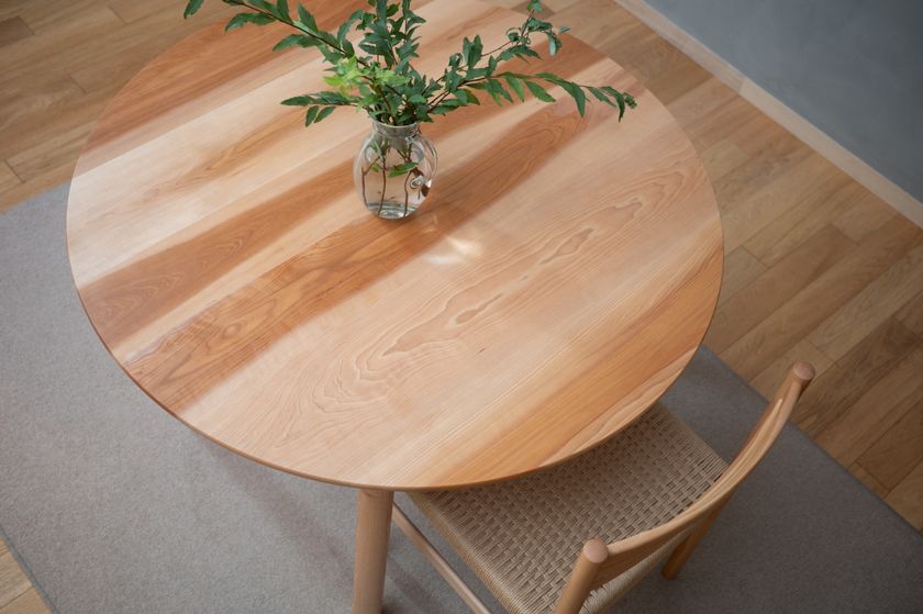 丸い形のテーブルは、家族や友人が自然と集まる場をつくります。アサダ材ならではの温かみのある色合いと特長的な木目が、食卓やリビングに穏やかな表情を添えます。アサダの魅力を存分に活かすためにあえてシンプルに仕上げたデザインは白鷺〈Egret〉のような、軽やかで静かな存在感を放ちます。