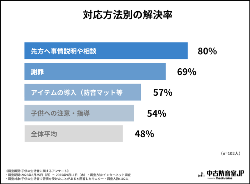 対処法別の解決率では、『先方への事情説明や相談』が80%と、謝罪の69%を上回る結果となりました。事情をそのまま伝えることで理解を得られるケースが一定数あることがうかがえます。直接相手とコミュニケーションを取れない場合やとるべきでない場合などでも、管理会社などの仲介者を通じて調整を図ることも、有効な選択肢といえるでしょう。