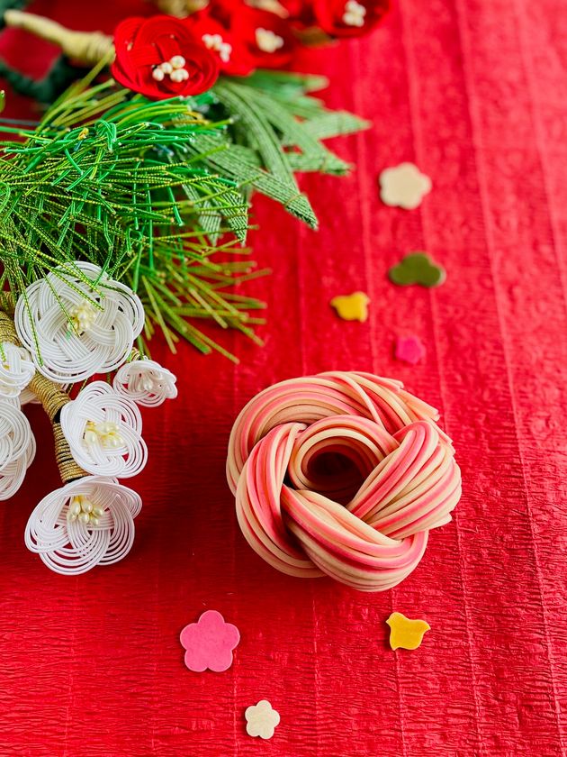 ピンクの麺と白の麺が一本の麺を成している縁起の良い紅白合わせ麺に、鶴、亀、千鳥、松、梅をかたどった飾り麺をあしらった細うどんです。