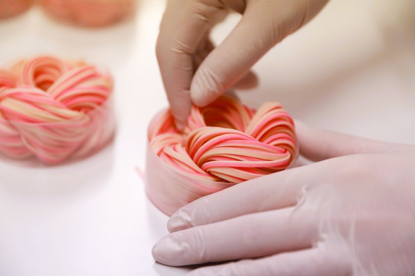 花や生き物などの形の麺を、土台となる花の形の手延べ麺にあしらった『knot charm』シリーズは、柿里商店の人気商品。