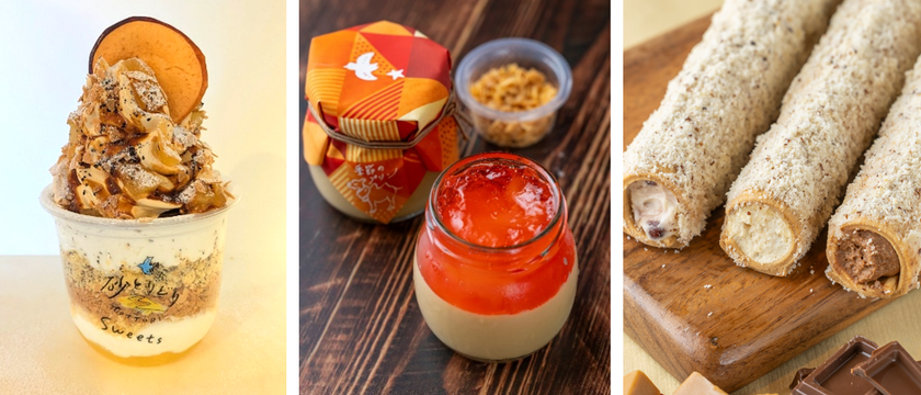 左から)砂パフェリンゴキャラメル/アップルパイプリン/スティックタルトりんごキャラメル