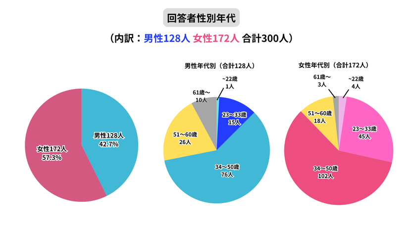 ・性別:男性 128名(42.7%)/女性 172名(57.3%)/合計 300名