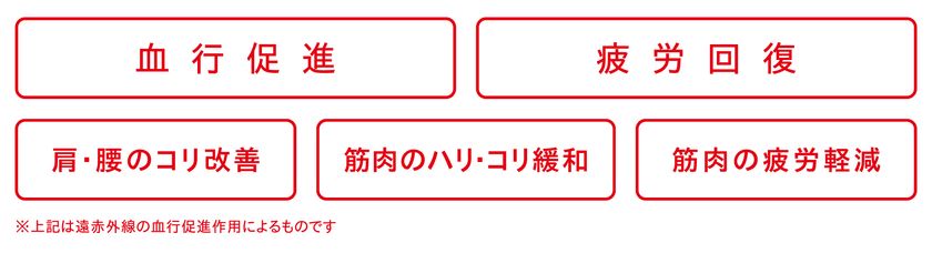 一般医療機器区分「家庭用遠赤外線血行促進用衣」として、「血行促進」「疲労回復」「肩・腰のコリ改善」「筋肉のハリ・コリ緩和」「筋肉の疲労軽減」の5つの効果が期待できます。