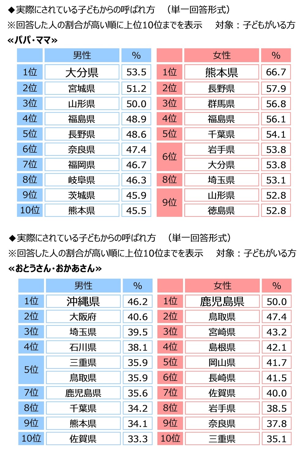 実際にされている子どもからの呼ばれ方のTOP2である「パパ・ママ」「おとうさん・おかあさん」について、それぞれ呼ばれている割合を都道府県別にみると、「パパ」が最も高くなったのは大分県(53.5%)で、宮城県(51.2%)、山形県(50.0%)が続き、「ママ」が最も高くなったのは熊本県(66.7%)で、長野県(57.9%)、群馬県(56.8%)が続きました。