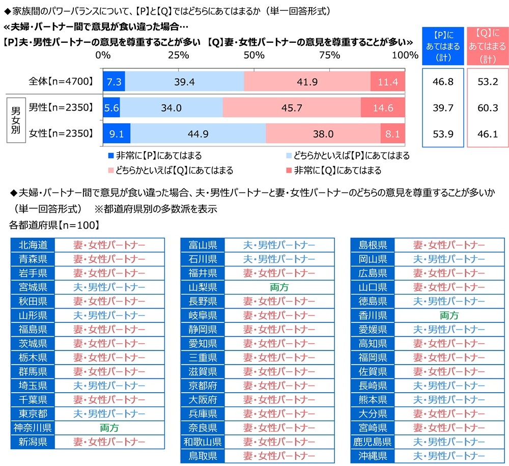 全回答者(4,700名)に、夫婦・パートナー間で意見が食い違った場合、夫と妻のどちらの意見を尊重することが多いか聞いたところ、『夫・男性パートナーの意見を尊重することが多い』(【P】にあてはまる(計):「非常に」と「どちらかといえば」の合計、以下同様)が46.8%、『妻・女性パートナーの意見を尊重することが多い』(【Q】にあてはまる(計):「非常に」と「どちらかといえば」の合計、以下同様)が53.2%となり、妻・女性パートナーの意見を尊重している夫婦・パートナーが多数派となりました。