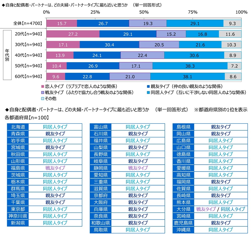 都道府県別にみると、多くの都道府県で1位は「同居人タイプ」、「親友タイプ」のいずれかとなり、福島県、静岡県、大分県では「戦友タイプ」が1位(大分県は「同居人タイプ」と同率)となりました。