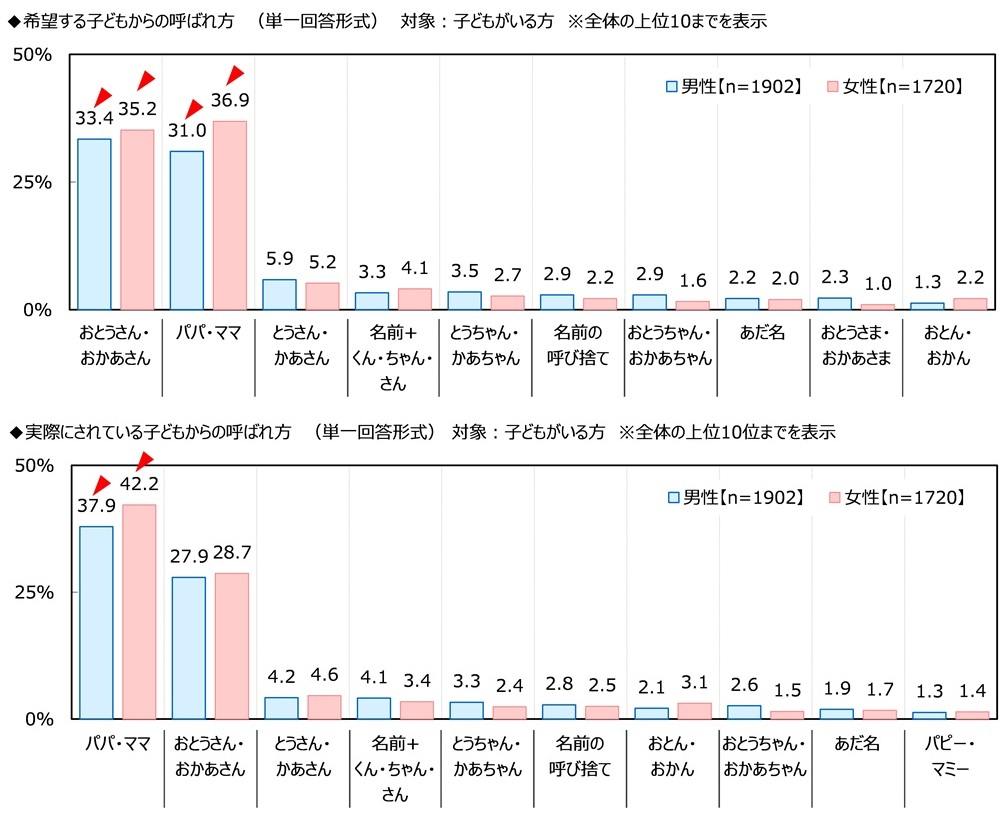 また、実際にされている子どもからの呼ばれ方を聞いたところ、男性では「パパ」(37.9%)が最も高く、次いで「おとうさん」(27.9%)、「とうさん」(4.2%)、「名前+くん・さん」(4.1%)、「とうちゃん」(3.3%)となりました。
