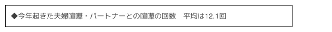 今年、夫婦喧嘩・パートナーとの喧嘩を何回くらいしたか聞くと、「0回」に最も多くの回答が集まりました。また、「1回」や「2回」、「5回」、「10~19回」にも回答がみられ、平均は12.1回でした。
