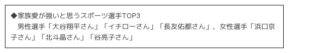 “家族愛が強い”というイメージに合うスポーツ選手を聞くと、男性スポーツ選手では「大谷翔平さん」がダントツとなり、2位「イチローさん」、3位「長友佑都さん」と続きました。女性スポーツ選手では1位「浜口京子さん」、2位「北斗晶さん」、3位「谷亮子さん」となりました。