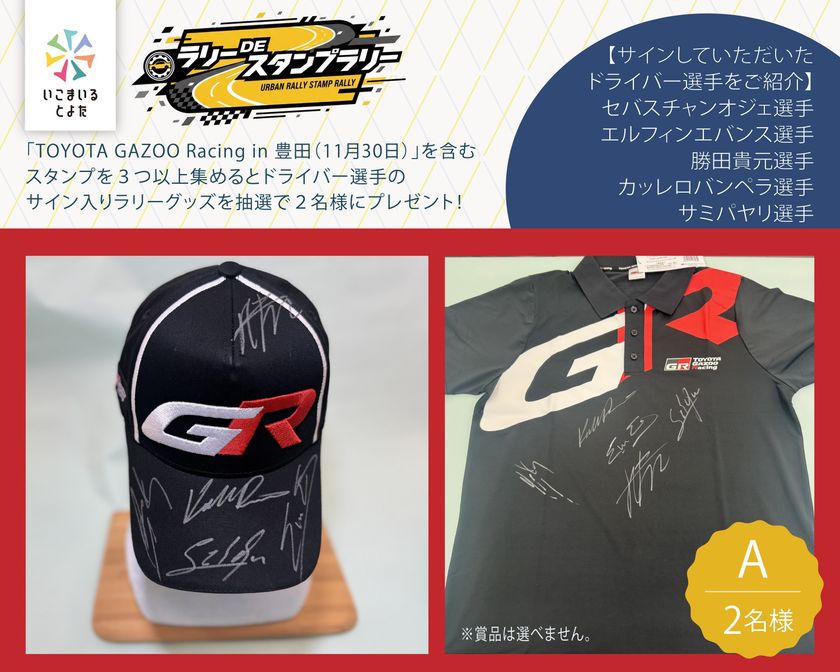 ※A賞の選手サイン入りグッズは「TOYOTA GAZOO Racingng ラリーチャレンジ in 豊田(11月30日)」に鞍ケ池公園でのチェックインが必須です。