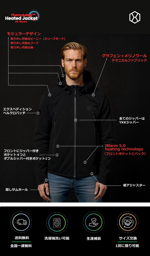 香港アパレルブランドGRAPHENE-X(グラフェン エックス)の日本総代理店GRAPHENE-X Japan(運営:株式会社ユナイテッド、本社:山形県米沢市、代表取締役:阿部 達也)は、2025年11月24日(月)より、待望の最新作『ThermAdapt Heatedジャケット』の予約販売を応援購入サイトMakuakeにて開始しました。