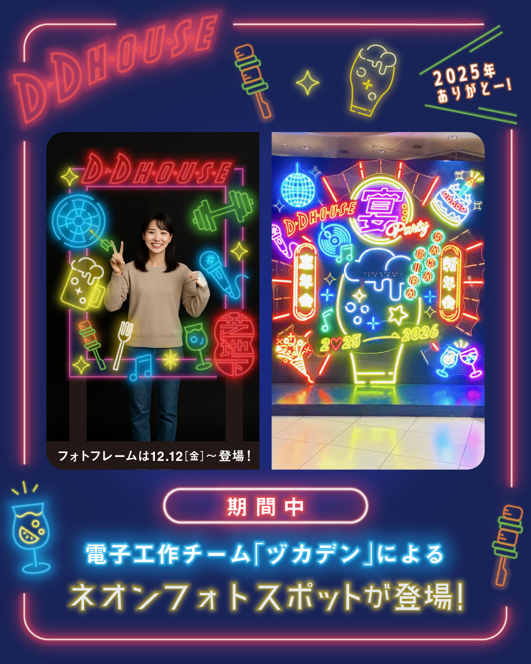 「バブルの象徴」として1985年に開業し、40年を迎える「D.D.HOUSE」が、忘新年会シーズンにあわせて、激アツなイベントを開催!2025年11月28日(金)~2026年1月12日(月・祝)の期間「D!D!忘・新年会」と題して、忘新年会にあわせたユニークなイベントを体験いただけます!