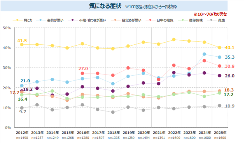 また、「日中の眠気」「不眠・寝つきが悪い」といった睡眠関連の悩みについても、昨年と概ね同程度で推移しており、生活者にとって日常的な健康課題となっていることがうかがえる。