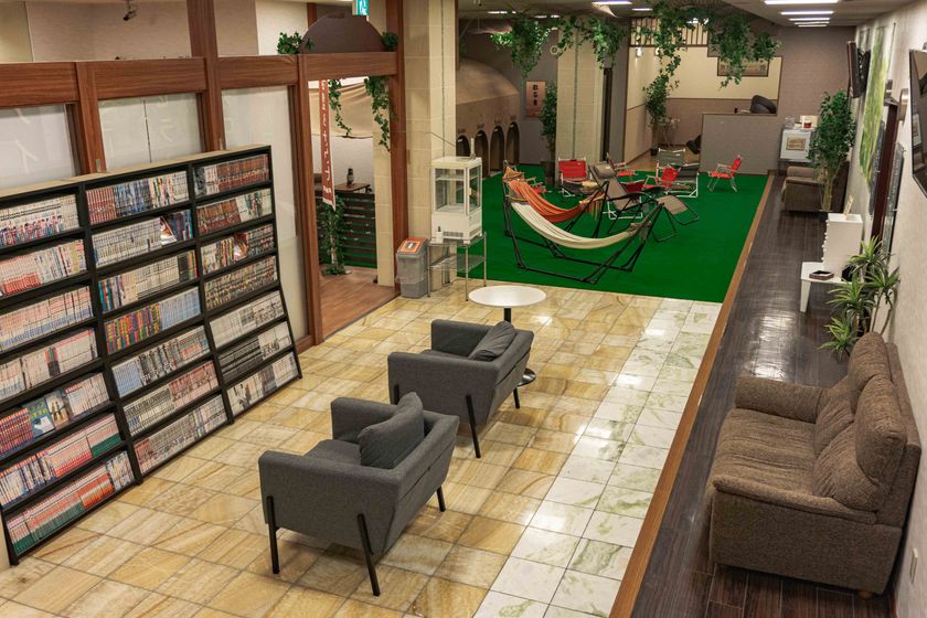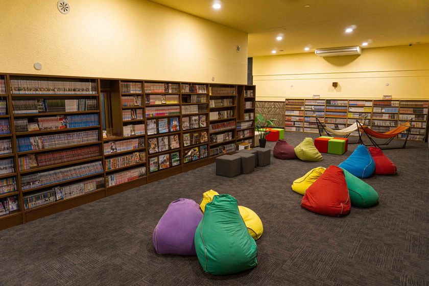 1階2階それぞれに大型休憩ラウンジがあり、1階ではソファやヨギボーに身を委ねながらコミックを読むなど静かな時間を過ごせます。2階はリクライニングチェアがズラリと並んだ空間になっていて、湯上りの体をゆっくりと休めることが出来ます。休憩ラウンジの他にも、パクパクと可愛らしく手の角質を食べてくれるドクターフィッシュや日焼けマシン(男性のみ)、各種ゲームやマッサージ機など1日中退屈することなく楽しめる空間となっております。