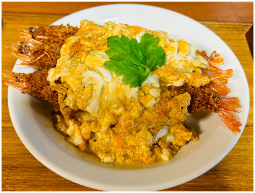 大ぶりの有頭エビフライを豪快に3尾のせ、だしの旨みがきいたふんわり玉子でとじたえび玉丼。
