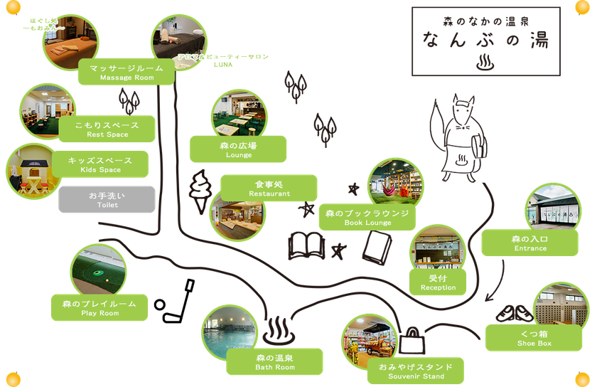 「森の温泉」をコンセプトに、森の中を探検するワクワク感と森林の癒しをイメージした可愛らしい空間へ内外装を昨年末に大幅リニューアル。「一日遊べるくつろぎ空間 温泉×食事×読書」をコンセプトに最大の特徴である温泉はそのままに、新たに本格グルメを味わえる食事処や約8,000冊の漫画や本、雑誌を読書できる「BOOK LOUNGE」、そして自由におくつろぎいただけるスペースを多数設置。、カウンターテーブルやWi-Fiも完備しておりますので、おひとり様からご家族連れまで、それぞれのライフスタイルに合った贅沢なリラックスタイムを満喫できる温泉施設に生まれ変わりました。