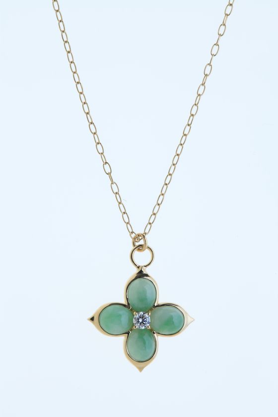 日本神話でも名高い、国石である糸魚川翡翠。その中でも色の揺らぎが美しい翡翠と、煌めきの象徴の石であるダイヤモンドを使用し、瀬戸内海の煌めきを日本の伝統模様「花菱」に見立て、和の素材の美しさと、縁起の良い日本の文様のストーリーを兼ねそろえたデザインのネックレスにしました。