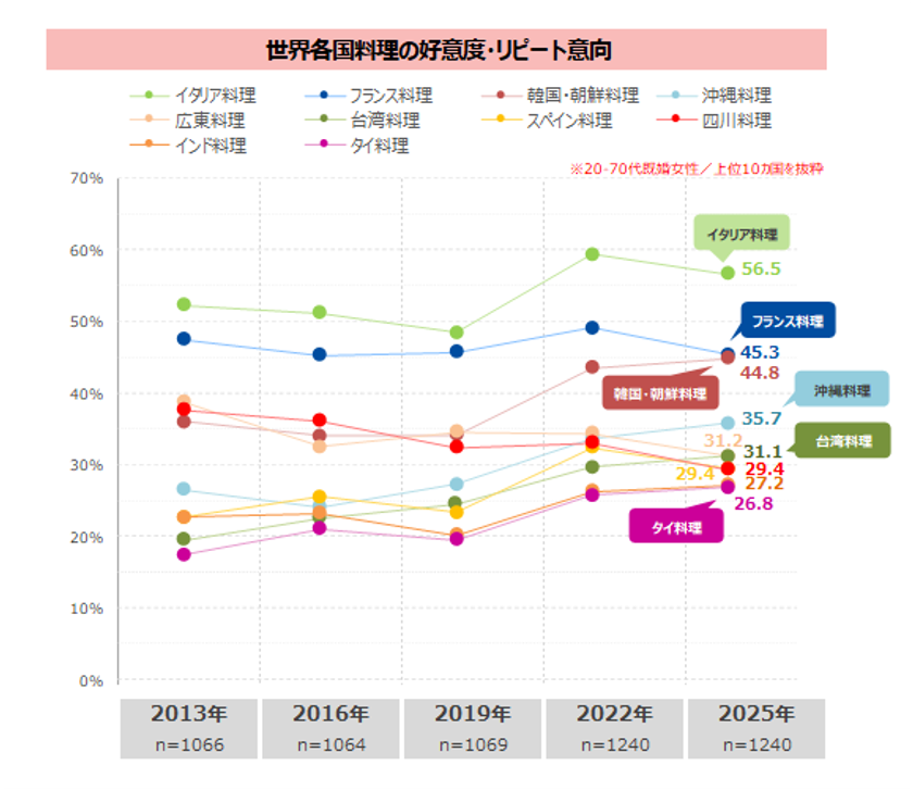 時系列でみると、上位2位の「イタリア料理」「フランス料理」は10年以上前から大きな変化はみられない。一方で「韓国・朝鮮料理」「沖縄料理」「台湾料理」「タイ料理」は、いずれも10ポイント前後伸長している。なお、「広東料理」「四川料理」といった中華料理の地域別分類は好意度が減少傾向にある。