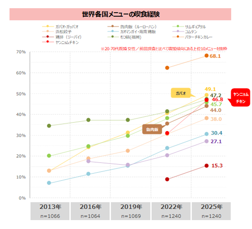 150以上ある各国のメニューの中で、3年前(2022年調査)と比べて、喫食経験が10ポイント以上増加したメニューは「ヤンニョムチキン」のみだった。次いで「ガパオ・ガッパオ」「魯肉飯(ルーローハン)」がいずれも8ポイント以上の増加。