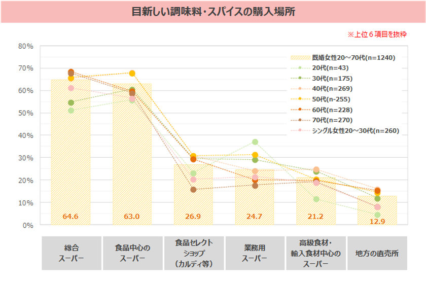 目新しい調味料・スパイスを購入する場所としては、「総合スーパー」「食品中心のスーパー」が6割台で最も高く、次いで「食品セレクトショップ(カルディ等)」「業務用スーパー」が続く。「食品セレクトショップ(カルディ等)」は30-60代の既婚女性においていずれも3割前後で、「業務用スーパー」は20代の既婚女性が4割弱と高い。