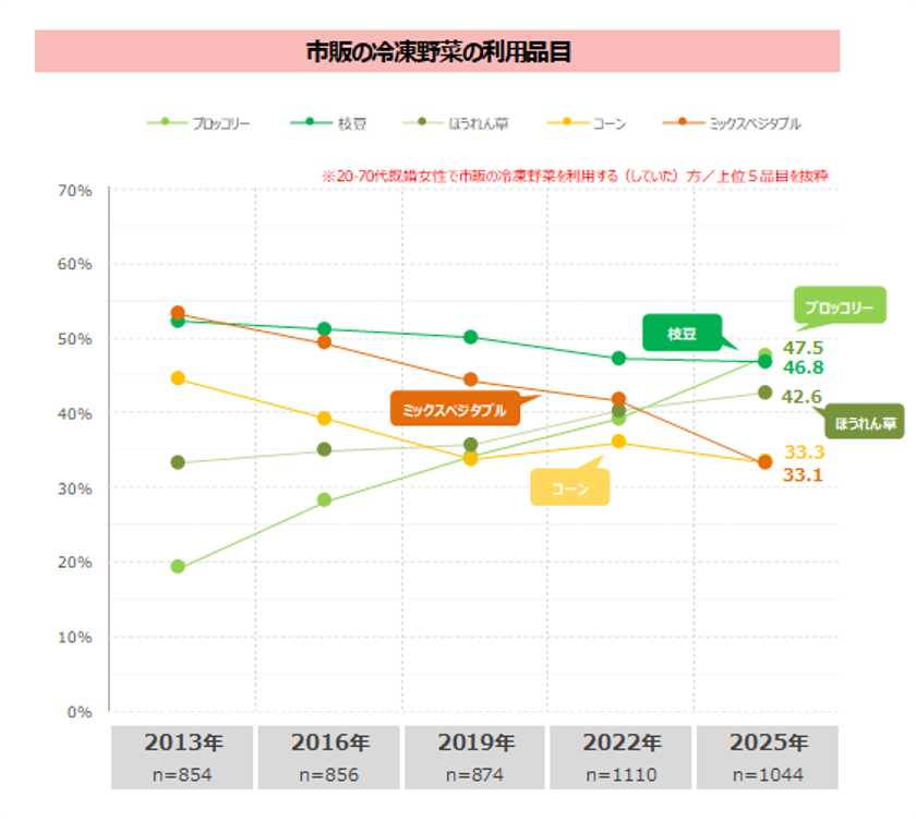 よく利用する市販の冷凍野菜について、20-79歳の既婚女性に確認したところ「ブロッコリー」が5割弱で最も高く、次いでほぼ同率で「枝豆」「ほうれん草」と続く。「ブロッコリー」は2013年調査時には2割を下回っており、調査のたびに増加、2025年調査でついに1位となった。