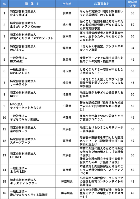 このたび、各都県で実施する「都県選考(一次選考)」と「本選考(二次選考)」による厳正な選考の結果、27団体へ1,468万円の助成を決定しました。