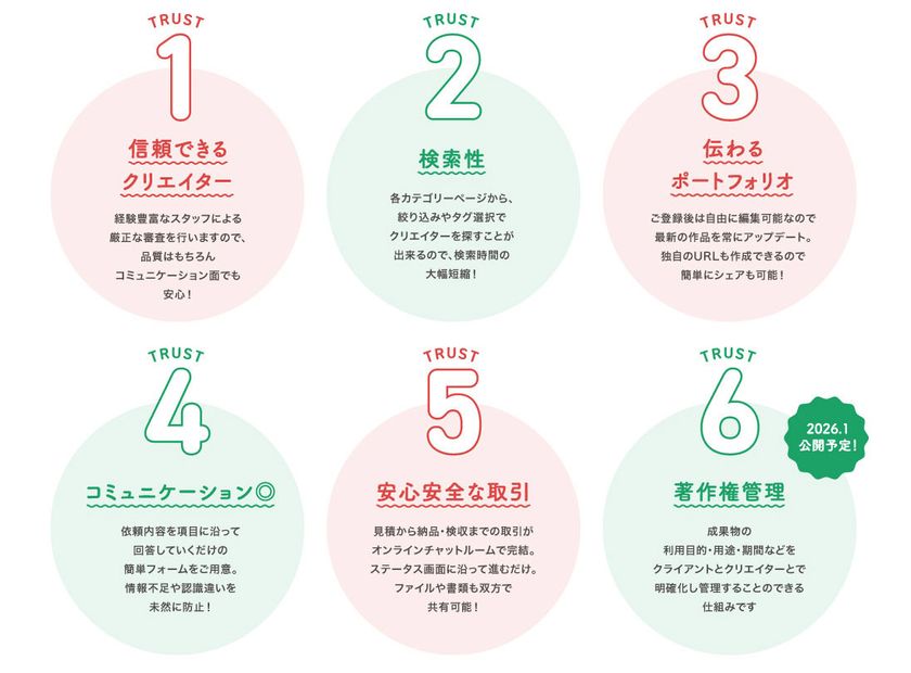 同時に、時代は大きく変化しています。生成AIの活用が広がり、創作が身近になる一方で、成果の水準や権利配慮、対話の質といった、クリエイティブの“正しい価値”が見えづらくなる局面も生まれました。だからこそ、私たちはクリエイターの皆様が安心・安全なルールのもとで正当に評価され、アウトプットがまっすぐクライアントに届く仕組みを、責任を持って実装します。