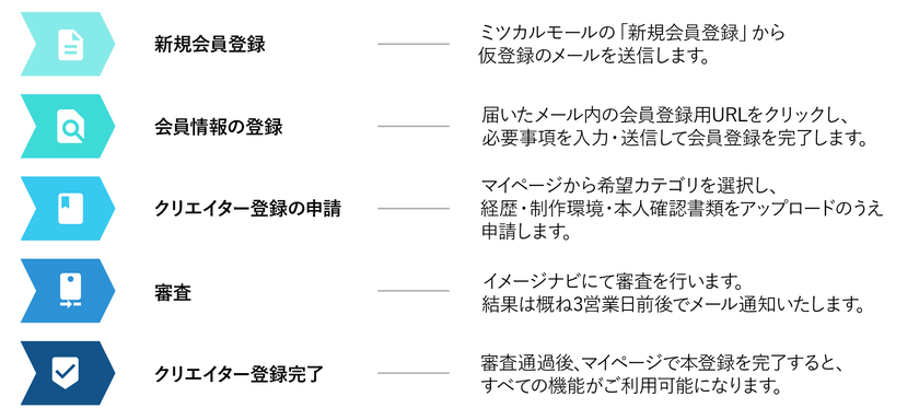 (5) クリエイター登録完了:審査通過後、マイページで本登録を完了すると、すべての機能がご利用可能になります。