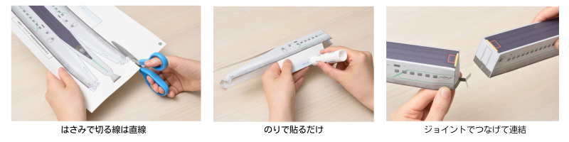 本書は、車両の連結もできる本格的なペーパークラフトながら、はさみで切る線は直線、組み立てものりで貼るだけ。説明文の漢字はふりがなつき。子どもだけでも楽しく作れる立体工作集です。