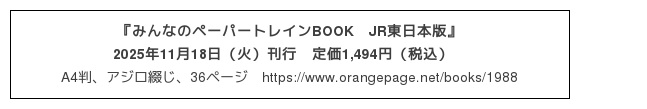 株式会社オレンジページ(東京都港区)は、JR東日本の人気列車を、はさみとのりだけで作れるペーパークラフトにし、鉄道ファンの子どもを中心に絶大な人気を博したシリーズを9年ぶりに復活させました。11月18日(火)発売の『みんなのペーパートレインBOOK JR東日本版』には、過去に掲載した列車の中から、2025年に運行を終了した寝台特急「カシオペア」をはじめ、人気の車両5種をピックアップ。また新たに新幹線試験車両「ALFA-X」を加え、全6種の車両を収録しています。
