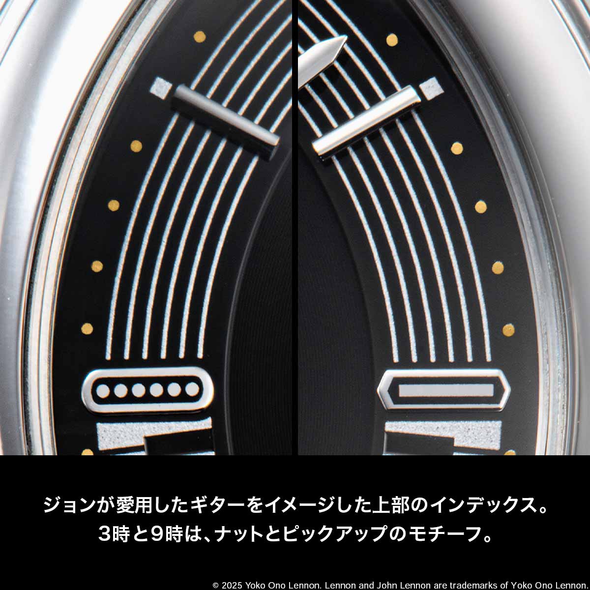 ジョン・レノンが愛用したギターをイメージした上部のインデックス。3時と9時は、ナットとピックアップのモチーフとなっています。