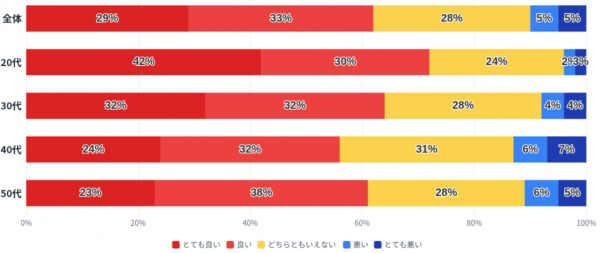 一方で、「どちらともいえない」は28%、「悪い」「とても悪い」は合計で10%となっています。