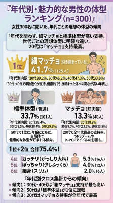 年代別クロス集計では、30代(46.2%)・40代(47.3%)で細マッチョの支持率が最も高い一方、50代では「標準体型」(39.2%)が「細マッチョ」(33.8%)を上回り1位に逆転しました。