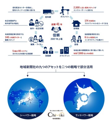 当社は、地域密着型の生活情報誌『ちいき新聞』の発行を軸に、情報発信および販売促進の総合支援事業を展開しており、年間約7,000社にサービスを提供しています。千葉県を中心に毎週発行している『ちいき新聞』は、専属の配布員により174万世帯へポスティングされ、創業以来40年以上にわたり配布を継続してきたことで、他に類を見ない九つのアセットを築いてきました。