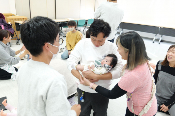 初めての体勢にドキドキしながらも、赤ちゃんの嬉しそうな表情に参加者の皆さんから笑顔と歓声がこぼれました。