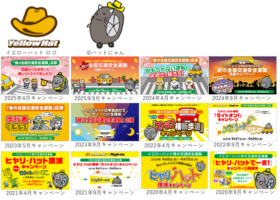 「全国交通安全運動応援キャンペーン」は、イエローハットが2019年から取り組んでいる社名に由来する「黄色い帽子」に交通事故防止の想いを込めた啓発活動です。毎年、「春の全国交通安全運動」と「秋の全国交通安全運動」の期間に合わせて、ドライバーの皆さまに交通安全の意識を高めてもらうことを目的にスタートいたしました。
