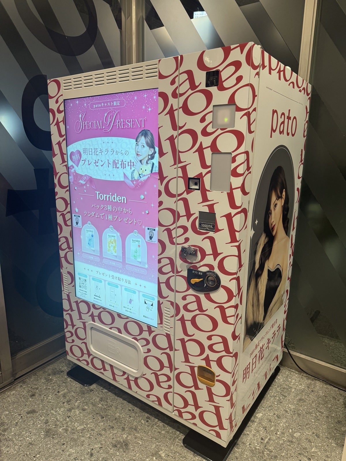 2024年9月3日より「patoユーザーへの還元」「patoキャストの地位向上およびクオリティ強化」の実現を掲げ、最高ブランディング責任者に就任した明日花キララさんは、patoユーザーへの還元施策として、patoキャストユーザーは話題の美容コスメのサンプリングを無料で手軽に手に入れられるようにIoT自動販売機を設置いたしました。