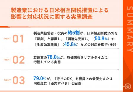 - 01|製造業経営者・役員の約6割が、日米相互関税15%を「深刻」と認識し、 「調達先見直し」(50.8%)や「生産効率改善」(45.8%)などの対応を進行/検討- 02|製造業の78.0%が、原価情報をリアルタイムに把握している実態- 03|79.0%が、「守りのDX」を経営上の最優先または同程度に「優先すべき」と回答