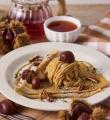 ご注文毎に焼き上げるクレープに、アールグレイ香る自家製のミルクティーソース、渋皮栗、マスカルポーネアイスクリームをトッピングし、マロンクリームを絞りました。