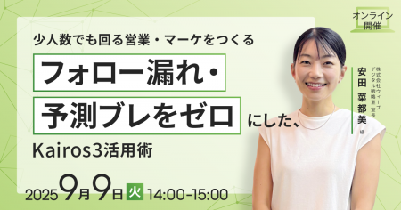 “次の一手”がデータでわかるMA+SFA一体型ツール「Kairos3(カイロススリー)」を提供するカイロスマーケティング株式会社(本社:東京都渋谷区、代表取締役:佐宗 大介、以下「当社」)は、オンラインセミナー「少人数でも回る営業・マーケをつくる フォロー漏れ・予測ブレをゼロにした、Kairos3活用術」を9月9日(火)に開催いたします。