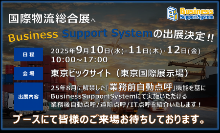 運送事業者様向け点呼システム「Business Support System(以下BSS)」を東京ビックサイト開催の「国際物流総合展」へ出展することが決定いたしました。