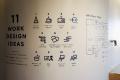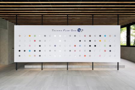 サインデザインと展示グラフィックを担当しました。この度はありがとうございました。本計画では、ワークショップやインタビューから導き出された「ワークデザインアイデア」の実現のため、初期段階から設計チームやクライアントと相談しながらプロジェクトに取り組みました。サインや展示では、エントランスの100種類のサンプルを手にとって比較できる製品展示や、自社製品を利用したサインなど、テクノフローワンの技術力や取り組みを社内外に発信するための工夫が随所に組み込まれています。