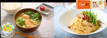 シーチキンとしょうがのおみそ汁(写真左)、Carboff(カーボフ)の豆乳入りピリ辛ペペロンチーノ(写真右)、シーチキンの旨みたっぷりチャンプルー、人参しりしりシーチキン、みかんたっぷり牛乳寒天など約30種類
