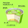 アロエ入りマスカットソース・おもち・白こしあん・バニラアイス・バターが香るケーキ生地の5層構造により、専門店のパフェのような贅沢感を実現。カップ側面の透明窓からは層の華やかさも楽しめ、見た目にも満足感のある一品です。