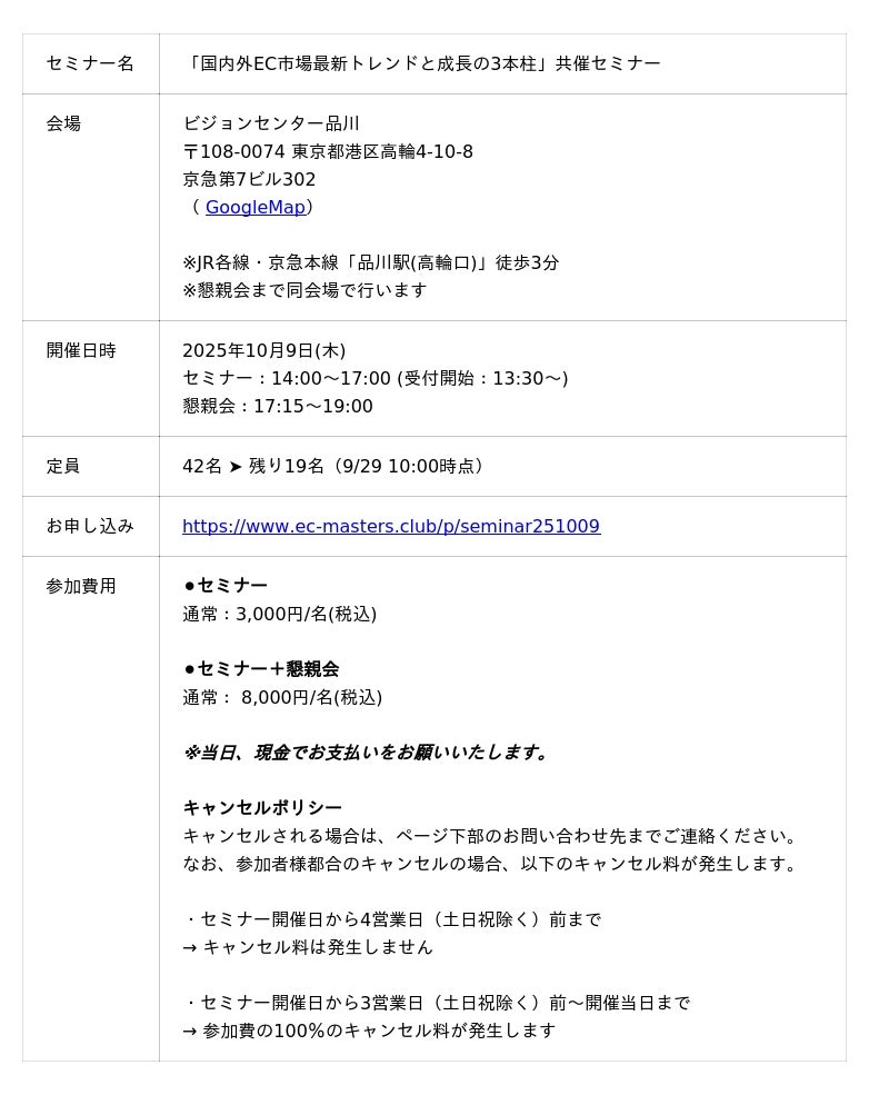 https://ec-masters.co.jp/- 電話番号:03-6682-9997- メール:seminar@ec-masters.net- 所在地:東京都渋谷区神宮前6-19-20 プレファス神宮前2階
